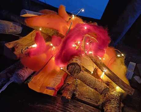 Det var selvfølgelig bålforbud på denne tiden av året. Tofterøy stillte derfor med elektronisk bål av farget ull og lyslenke. Det ble litt kos av det også.