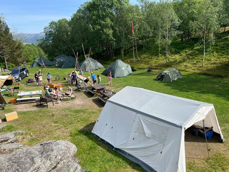 Selv om årets pinse kom rett etter 17. mai i år, ble vi rundt 40 speidere og ledere som deltok på leir på Kvarven fra lørdag til mandag. Det var strålende og varmt vær. Vi fikk padlet, badet, bygge leir, leirbål og mye morro. For mange var det mye å lære når bord og vaskebenk skulle bygges.